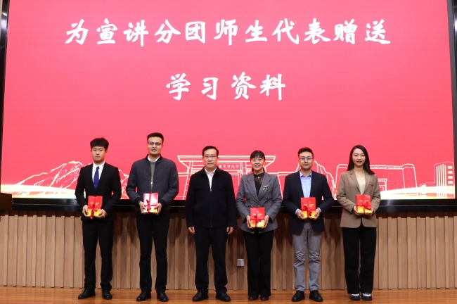 宣讲报告前,徐剑波为学校五个宣讲分团的师生代表赠送学习资料,并为宣讲团授旗。宣讲结束后,徐剑波还与学生代表进行了互动交流。