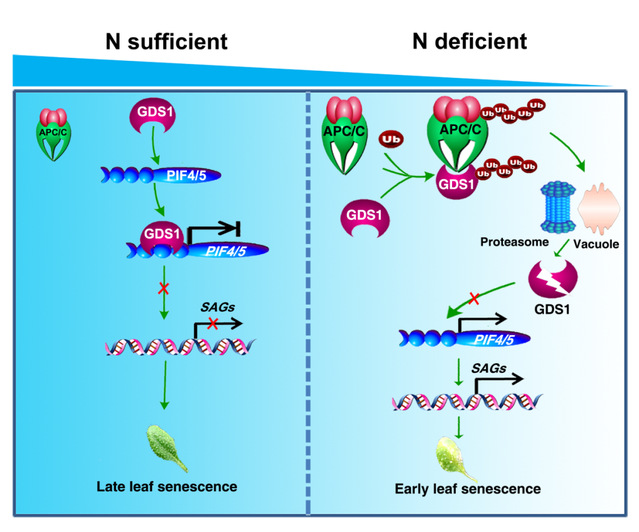 该研究发现,在氮充足的条件下,GDS1结合并抑制PIF4/PIF5的表达,进而延缓叶片衰老。而在低氮条件下,APC/C E3泛素连接酶复合体促进GDS1的泛素化和降解,进而解除GDS1对PIF4/PIF5的抑制作用,激活下游衰老相关基因的表达,从而导致叶片早衰(图1)。