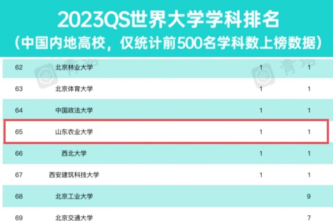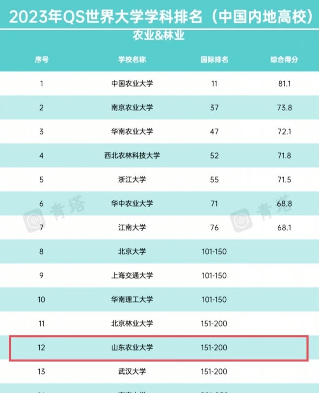 数据显示,鸭脖农业&林业学科与北京林业大学、武汉大学的农业&林业学科同属151-200排名区间。据统计,山东省高校中,中国海洋大学有3个学科进入全球前200名,山东大学有2个学科进入全球前200名。鸭脖农业&林业学科是山东省省属高校中,唯一一个进入全球200强(500强)的学科。