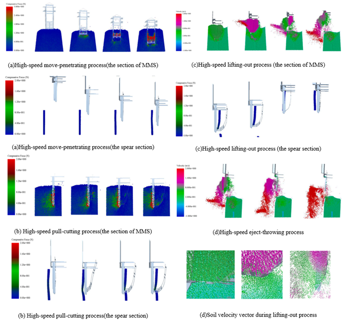 针对芦笋脆嫩多汁、易断易损伤的特点,以及土中作业过程中的一些参数难以有效测量的难点,该研究创新设计了刚柔耦合拉切末端执行器(PCEE),通过前行入土、拉切、出土、抛射4个子过程实现高效、低损伤收获,整个采收过程笋芽由土壤包裹损伤概率极小。通过建立PCEE-土壤-笋模型,利用双向耦合MBD-DEM (Multi-Body Dynamics and Discrete Element Method,多体动力学与离散单元法)分析采收过程,明确了高速采收过程中末端执行器的构型变化以及部件-土-笋之间的互作耦合机理和粒子的运动规律,对末端执行器的结构设计、作业参数优化、采收性能提升具有重要的理论依据。
