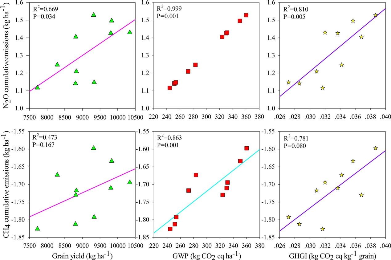 图2. 粮食产量、全球变暖潜能值(GWP)和温室气体强度(GHGI)与温室气体排放之间的关系