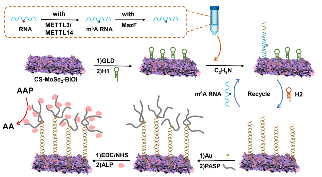 研究表明,N6-甲基腺嘌呤(m6A)的表达与干细胞自我更新、昼夜节律、发育缺陷、肥胖、突触信号和癌症有关。因此,m6A的定量检测在生物学和化学生物学领域具有重要意义。由于m6A的甲基惰性,共价识别法很难实现对m6A的特异性检测;抗原抗体免疫法是目前应用最广泛的方法,但抗体价格昂贵,保存条件苛刻,批次间差异较大。因此,本工作拟采用相关蛋白识别法实现m6A的特异性检测。基于此,该研究旨在开发一种操作简便,灵敏度高,无抗体的光电化学生物传感器用以同时检测甲基化RNA、METTL3/METTL14蛋白和MazF蛋白。