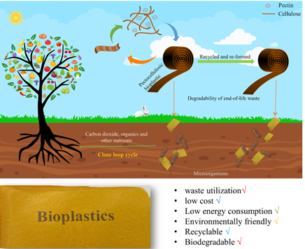 图1. 果胶纤维素生物塑料的制备、循环利用和和性能的示意图