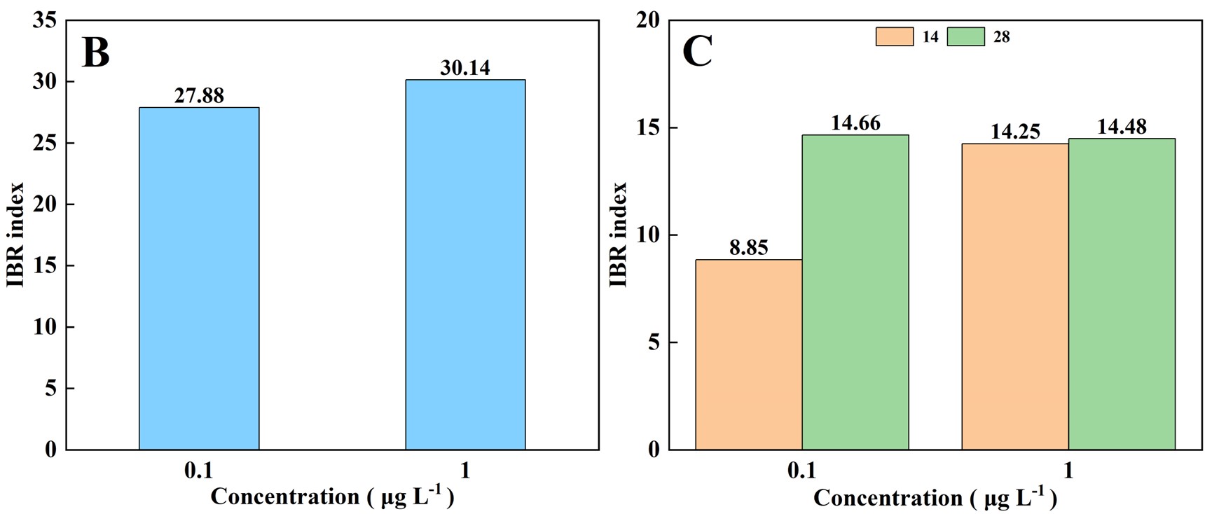 图2. 暴露于双氟磺草胺后斑马鱼幼鱼和成鱼指标IBR的星形图(A)及斑马鱼幼鱼(B)和成鱼(C)各项指标IBR值