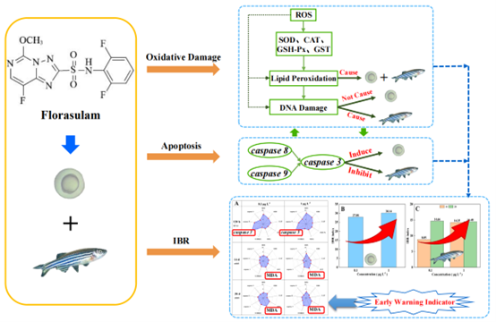 大多数化合物在进入生物体时会引起氧化应激。氧化应激是由外部污染引起的毒性作用机制之一,它可以改变生物体的免疫功能,导致细胞成分受损,严重时甚至导致细胞凋亡。该研究发现双氟磺草胺会使斑马鱼幼鱼和成鱼体内氧化应激相关指标活性氧水平显著升高并激活抗氧化系统。双氟磺草胺对斑马鱼幼鱼和成鱼均造成了脂质过氧化。双氟磺草胺未对幼鱼造成DNA损伤,但对成鱼造成了DNA损伤。凋亡相关基因caspase 3/8/9的表达变化说明幼鱼体内的细胞凋亡受到了诱导,而成鱼体内的细胞凋亡则受到了抑制。