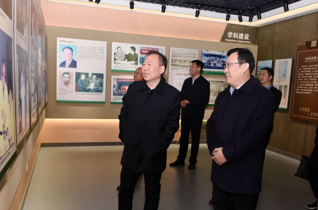 在校史馆,王修林一行听取了党委书记徐剑波关于学校办学历程和近期发展取得的成绩介绍,详细考察调研了学校校史馆展陈情况,王修林对山东农大悠久的办学历史、深厚的文化底蕴和取得的发展成就给予充分肯定。他希望山东农大继续全面贯彻党的教育方针、落实立德树人根本任务,坚持为党育人、为国育才的初心使命,以党的二十大精神为指引,培养出更多担当民族复兴大任的时代新人。在小麦育种全国重点实验室,王修林一行看望慰问学校科研工作者,实地查看学校科研开展情况,分别与小麦遗传改良及基因组学孔令让教授团队、果树种质资源与遗传育种陈学森教授团队围绕科研进展、工作思路和发展方向进行了深入交流,对专家们在乡村振兴战略中表现出的担当和奉献精神,给予高度评价,希望他们继续肩负好使命责任,为打造乡村振兴齐鲁样板作出新的更大贡献。