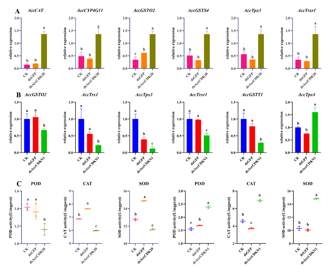 图1. 沉默AccCDK20和AccCDKN1后,抗氧化相关基因表达及酶活水平分析