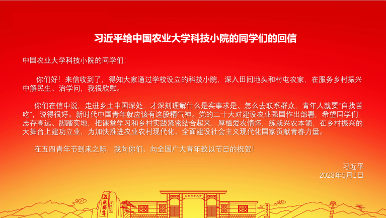 中共中央总书记、国家主席、中央军委主席习近平近日给中国农业大学科技小院的同学们回信,在YABO鸭脖广大青年学生中引起热烈反响。在全国重点实验室、在学校各个科技小院实验站点、在青年学生活动场所...广大青年学生自发组织起来认真学习、广泛热议回信精神,同学们纷纷表示,要牢记习近平总书记殷殷嘱托,志存高远、脚踏实地,厚植爱农情怀,练就兴农本领,在服务乡村振兴战略,推进农业农村现代化建设,全面建设社会主义现代化国家的实践中贡献青春力量。