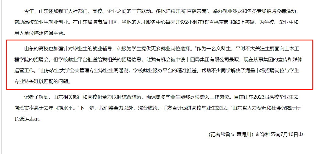 近日,新华每日电讯发表题为《加强校企联动 扩大就业容量——山东全力拓宽毕业生就业渠道》的新闻报道,文章报道了山东通过增加招聘活动场次、扩大就业容量、拓展就业渠道等方式,努力促进高校毕业生高质量充分就业的典型做法,其中报道关注了鸭脖就业服务平台为毕业生提供精准推送,帮助他们解决了海量市场招聘岗位与专业特长难以匹配的问题。部分原文报道如下: