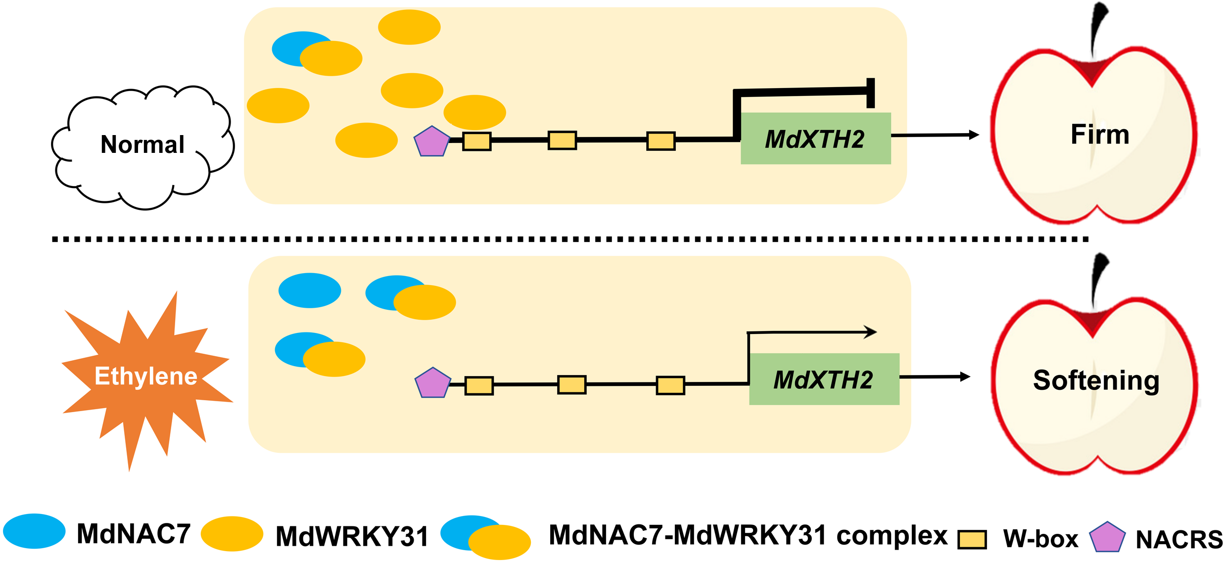 今日,YABO鸭脖园艺科学与工程学院苹果果实品质生物学与营养健康团队在Plant Biotechnology Journal期刊上发表了题为“MdWRKY31-MdNAC7 regulatory network: orchestrating fruit softening by modulating cell wall-modifying enzyme MdXTH2 in response to ethylene signalling”(https://doi.org/10.1111/pbi.14445)的研究论文,揭示了乙烯调控苹果果实软化的分子机制。