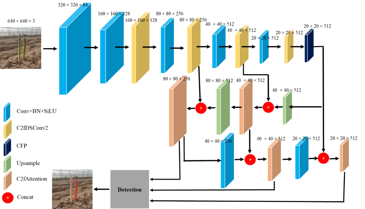 针对以上技术难题,YABO鸭脖苑进教授团队以大田种植的绿芦笋为研究对象,首创了S2CPL绿芦笋选择性采收过程中采收适宜性评价和土下切割点精确定位的关键方法。该方法利用RGB-D传感器获取绿芦笋的图像和空间深度信息,对YOLOv8的实例分割算法进行了研究和改进提高分割精度,同时提出了一种利用图像掩模融合深度信息计算绿芦笋长度和直径的三维形态提取方法,最终实现了机器人选择性采收的收获评价和图下三维切割点定位。该项研究还建立了一种为机械化采收末端执行器提供目标点信息的相机位姿优化方法。该技术有望为提高绿芦笋选择性采收中的视觉定位系统提供重要核心技术,实现成熟绿芦笋自动化、智能化采收,促进绿芦笋产业的发展。