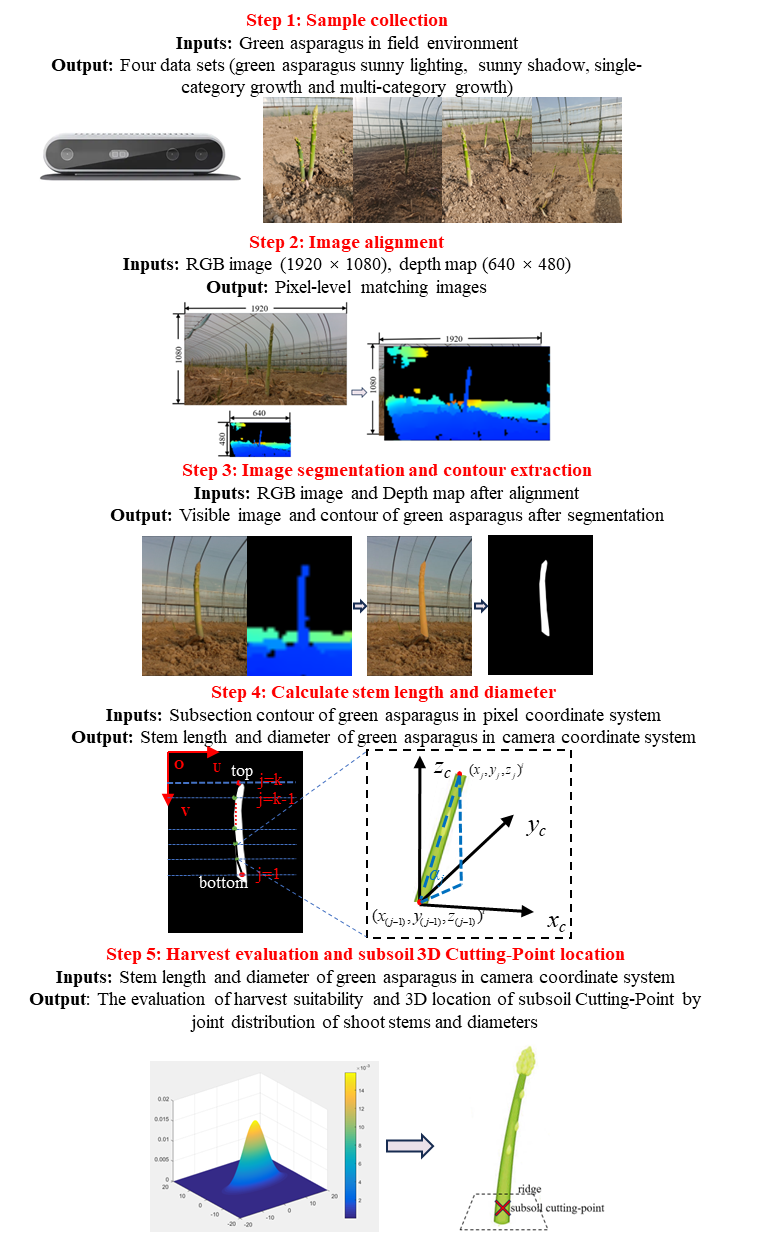 芦笋是一种多年生宿根性草本植物,在20世纪80—90年代中国已成为世界上栽培面积最大的芦笋生产国和产品出口国,面临着收获绿芦笋的挑战。芦笋生长密集,同一根系生长出来的芦笋嫩芽生长方向、生长成熟不一致,具有快速、零星生长的特点。目前全国几乎所有芦笋采摘等繁重的体力劳动仍由农民人工完成,绿芦笋的采收需要根据其长度仔细选择成熟的茎,另一方面,我国芦笋一般生长在山脊上,需要用芦笋刀在地表以下1至2cm的深度人工切割,因此这是一项劳动密集型和耗时的工作。实现田间绿芦笋智能选择性采收的关键在于采收适应度(长度、直径等)的判别和绿芦笋底土切点的精确定位。