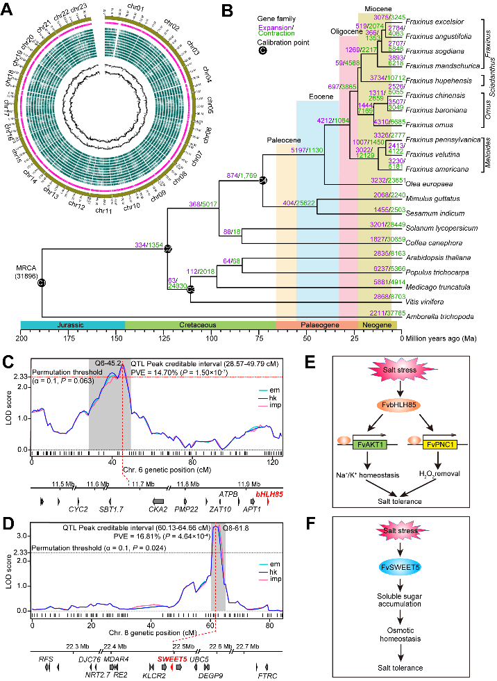 梣属(Fraxinus)包括40多个落叶乔木或灌木树种,广泛分布于北半球的暖温带和亚热带地区。梣属树种具有丰富的遗传多样性和广泛的生态环境适应性,如原产于北美洲的绒毛梣(F.velutina)和美国白梣(F. americana)引种到中国后,作为重要的耐盐树种用于盐碱地造林和景观绿化。杨克强教授团队测序、组装和注释了11个梣属树种染色体水平级的全基因组序列,构建了梣属物种的泛基因组图谱,全面分析了梣属物种的系统进化和耐盐适应性;利用种间杂交F1群体,构建了基于存在-缺失变异(presence-absence variation)的PAV遗传连锁图谱,定位了2个与耐盐性显著相关的PAV-QTL位点Q6-45.2和Q8-61.8,从中分别鉴定出了FvbHLH85和FvSWEET5耐盐基因;基因功能分析表明,FvbHLH85基因介导了Na+/K+平衡和ROS稳态,FvSWEET5基因促进了可溶性糖的积累,进而增强了植株的耐盐性。研究结果丰富了梣属物种基因组数据,加深了对梣属物种进化适应性的理解,挖掘分析了耐盐基因的功能,为梣属树种基因组学研究和耐盐遗传改良奠定了基础。