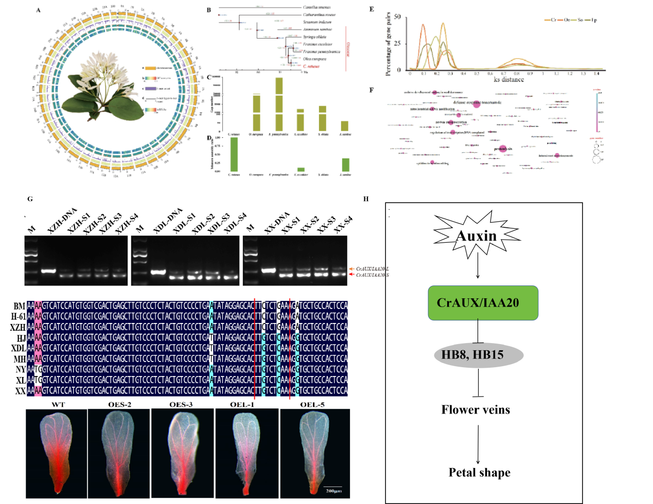 流苏树(Chionanthus retusus L.),属于木犀科(Oleaceae)流苏树属 (Chionanthus)落叶乔木,是华北地区重要的乡土树种,也是优良的园林绿化观赏树种。研究选取了一种流苏树新品种——雪早花(Chionanthus retusus cv. Xuezaohua)为实验材料,应用PacBio HiFi和ONT三代测序技术,成功组装了首个高质量、无间隙流苏树参考基因组。组装的两个雪早花单倍型基因组大小分别为687 和 683 Mb,contig N50为31.57 Mb,BUSCO评分为99.3%,成功解锁了流苏树基因组中端粒和着丝粒区域,对流苏树基因组学及分子育种研究具有重要的参考意义。通过表型和细胞学分析发现,流苏树花瓣维管组织的差异是流苏树花形态变异的主要原因。在基于基因组的转录组分析中,生长素相关基因负责花瓣形状的形成。最后,我们确定了一个流苏树花形态发育的关键基因,CrAUX/IAA20,其表达量与花瓣维管组织表型呈现显著的负相关。功能验证发现,CrAUX/IAA20中第一个内含子的去除和保留导致了两个转录本的产生,CrAUX/IAA20表达水平的差异导致了花脉的变化。我们的发现将为流苏树的品种改良提供了新的见解和潜在的基因资源,加深我们对花形态发育的理解,并为木犀科植物的栽培提供重要的理论支持。