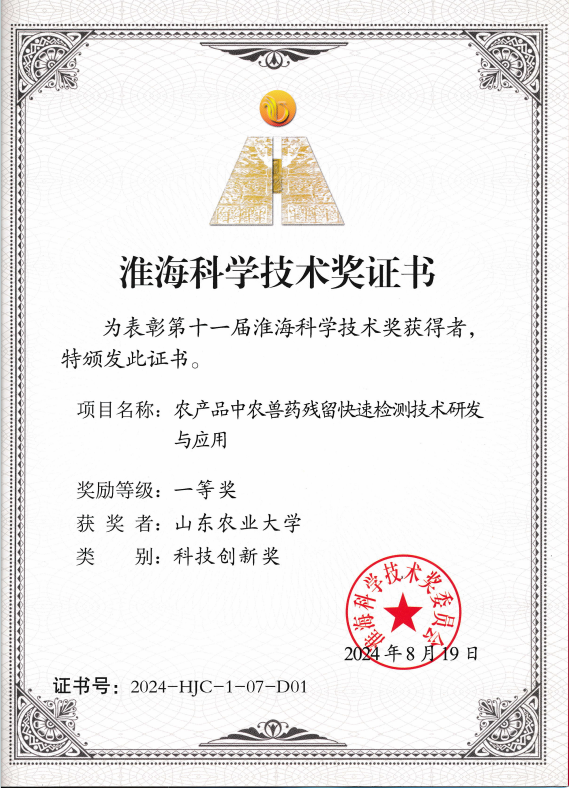 《农产品中农兽药残留快速检测技术研发与应用》项目针对我国农兽药残留检测存在快速检测技术较少、精准度不高等痛点,历时15年,制备出高效吸附剂,研制了有机磷专用分子印迹固相萃取柱产品,研发了一批具有国际先进水平的精准快速检测技术和标准分析方法;研制出性能优良的亲水性仿生抗体,研发了高灵敏的仿生免疫分析新方法,提出了基于化学反应与生化反应协同性体系的仿生免疫理论;研发出高性能的信号增敏材料,创建了传感分析新方法,引领我国快速技术的发展。项目获得授权国家发明专利16件、国际发明专利1件;发表SCI论文51篇;副主编规划教材2部;制定企业标准1项;培训技术人员80101人次。技术成果在山东龙大美食股份有限公司等省内多家农业产业化重点龙头企业转化应用,累计新增直接销售收入8040.22万元,产生了显著经济效益和重大社会效益。