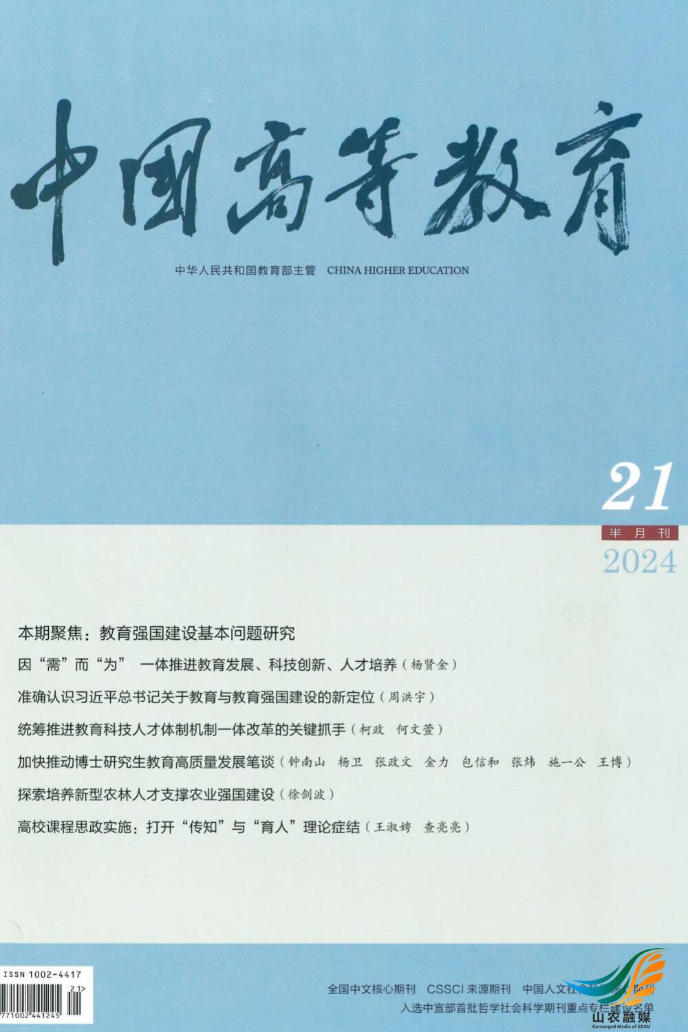 据了解,《中国高等教育》是由教育部主管、中国教育报刊社主办的学术期刊,创刊于1965年,素有“高教第一刊”的美誉。该期刊注重权威解读和方向引领,关注高等教育领域的重点、热点和难点问题,是我国高等教育理论研究和工作交流的重要平台。