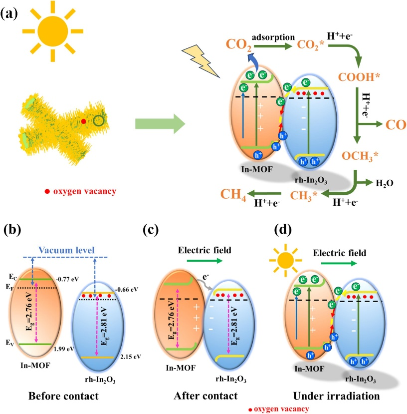 金属-有机框架(MOF)材料由于具有孔径可调、表面可裁剪、比表面积大等优点被广泛应用于光催化还原CO2领域。然而,MOF材料在光催化中存在光吸收范围窄和光生载流子易复合等问题,大大限制了其光催化还原CO2活性。以MOF材料为模板构筑S型异质结,从而提高MOF的光吸收范围和电子-空穴分离效率,是将MOF应用于光催化还原二氧化碳的研究热点。在这项工作中,我们创新性地采用原位部分煅烧方法,将In-MOF转化为富含氧空位的In2O3@In-MOF S型异质结,扩大了In-MOF的光吸收范围,提高了In-MOF的光生电荷分离效率,并且保留了In-MOF和In2O3的高氧化还原能力,从而提升了In-MOF的光催化还原CO2活性。这项工作为设计MOF基S型异质结高效光催化还原CO2提供了一种新策略。