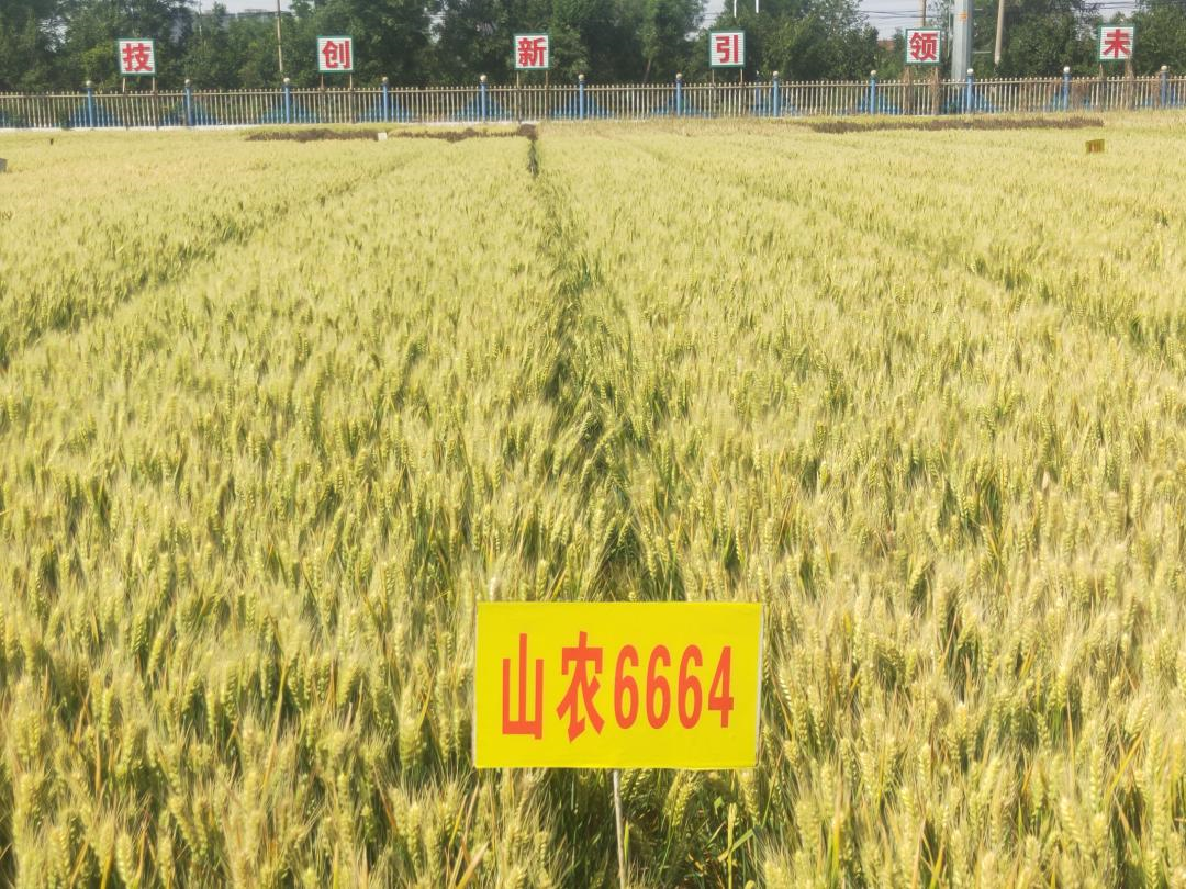 山农77号(原名山农6664),审定编号:鲁审麦20240001。由刘树兵教授团队选育,冬性,幼苗半匍匐,株型半紧凑,旗叶上举,成熟落黄好,熟相好。比对照济麦22早熟1-2天;株高80.8厘米;亩最大分蘖94.0万,亩有效穗43.2万,分蘖成穗率47.1%;穗粒数38.8粒,千粒重45.3克,容重793.7克/升;穗长方形,长芒、白壳,白粒、籽粒硬质。成穗能力强,越冬抗寒性好。在2021-2023年山东省小麦品种高产组区域试验中,两年平均亩产643.1公斤,比对照济麦22增产7.6%;2023-2024年高产组生产试验,平均亩产627.5公斤,比对照济麦22增产3.8%。综合抗性好,抗穗发芽、黄花叶病,中抗白粉病,中感条锈病、赤霉病和纹枯病。