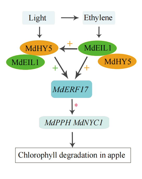 研究表明,光照能够促进乙烯合成,而乙烯和光共同作用,促进成熟期苹果叶绿素降解,从而导致果实快速褪绿。乙烯和光诱导MdEIL1和MdHY5的表达,这两个基因进一步上调叶绿素降解相关基因MdERF17、MdNYC1、MdPPH和MdPAO的表达。此外,MdEIL1和MdHY5能够直接结合MdERF17的启动子,从而上调其表达,形成的MdEIL1-MdHY5复合体增强了对MdERF17的调控作用。同时,MdEIL1也能直接结合MdHY5的启动子,促进其表达,MdEIL1-MdHY5复合体进一步增强了MdEIL1的调控功能。这些研究结果揭示了乙烯和光通过MdEIL1-MdHY5基因模块促进成熟期苹果叶绿素降解,从而加速果实褪绿的分子机制。