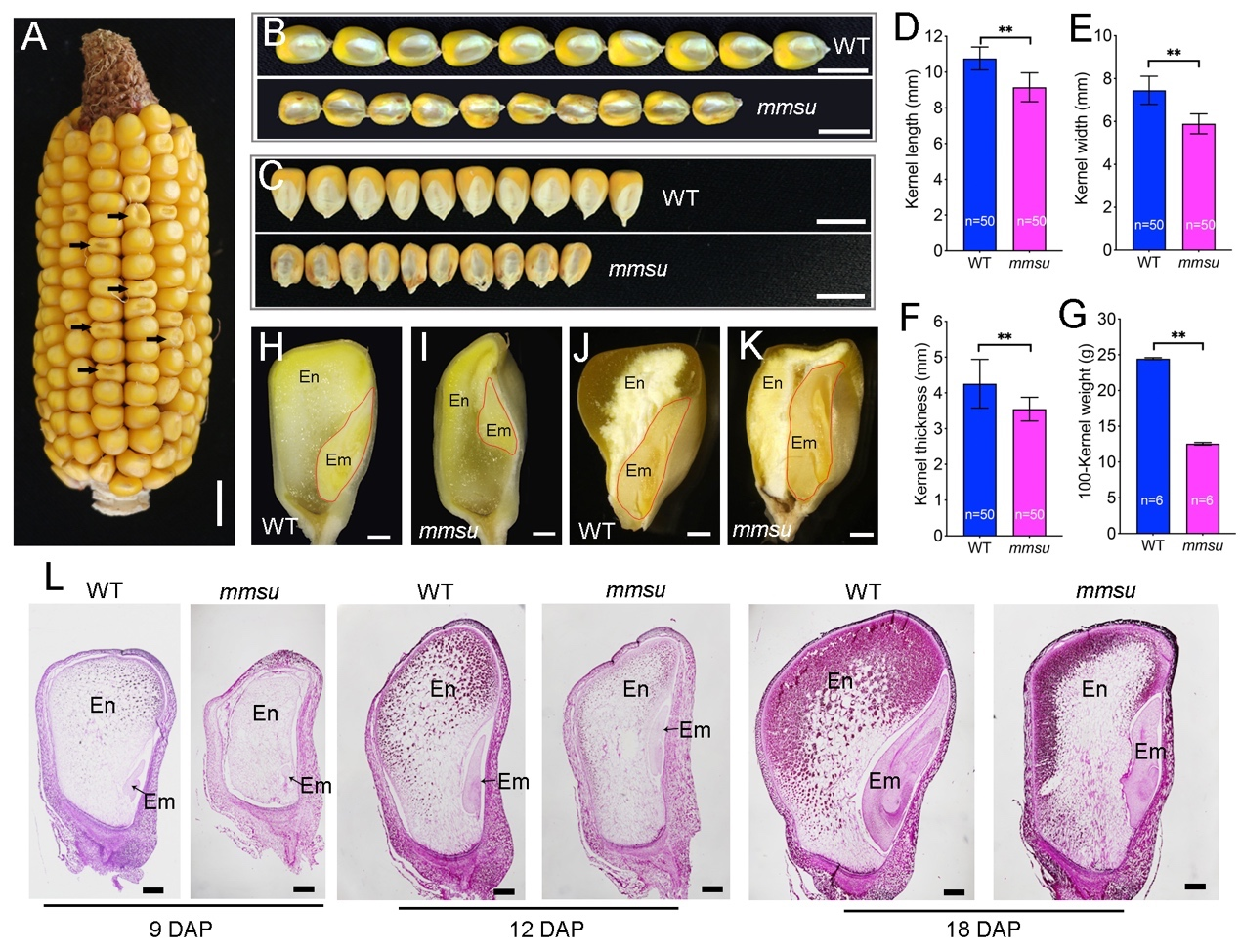 研究团队今年3月份在《Plant Physiology》发表的论文中鉴定到一个易感玉米瘤黑粉病且株高矮化的突变体maize mutant highly susceptible to U. maydis (mmsu),揭示了玉米ZmADT2基因在调控玉米植株发育及瘤黑粉病抗性方面发挥重要作用。在此基础上,研究团队进一步解析了ZmADT2调控玉米籽粒发育作用。研究结果表明mmsu籽粒籽粒变小,百粒重降低,胚和胚乳发育迟缓,籽粒中淀粉积累和蛋白含量减少,胚乳中生长素含量降低,胚乳细胞面积减小。基因表达谱分析显示,mmsu籽粒中营养积累和生长素信号通路受影响。外源施加生长素可以恢复mmsu籽粒发育迟缓的表型。以上结果表明,ZmADT2介导的生长素信号在玉米籽粒营养积累和发育中起着重要作用。