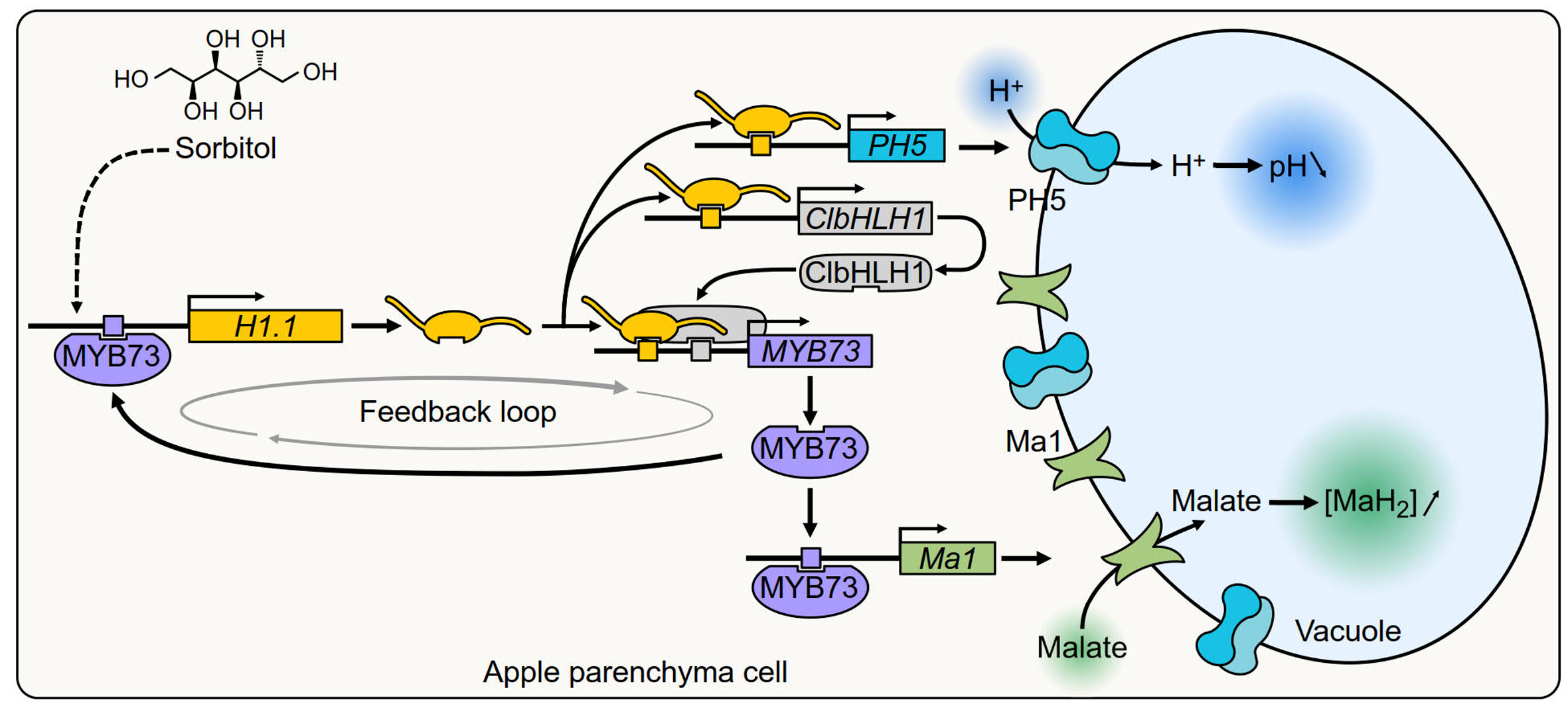 本研究发现,山梨糖醇合成减少的6-磷酸醛糖还原酶(Aldose-6-phosphate reductase, A6PR)反义株系果实中苹果酸的含量降低;qRT-PCR分析表明,在A6PR反义株系果实中,许多与苹果酸相关基因的表达下调,这些基因涉及负责苹果酸运输的基因,如铝离子激活的苹果酸转运蛋白MdALMT9 (Ma1),P型ATP酶MdPH5;MYB转录因子MdMYB73和新型翼螺旋DNA结合功能的Linker Histone MdH1.1等。山梨醇饲喂试验表明,MdH1.1、MdMYB73和Ma1三个基因对果实中山梨醇介导的苹果酸积累至关重要。生化分析显示,MdH1.1直接结合MdMYB73、MdCIbHLH1和MdPH5这三个基因的启动子,激活它们的表达。同时,MdMYB73反过来直接与MdH1.1基因启动子结合正向调控其表达。因此,MdH1.1与MdMYB73形成正反馈回路,促进苹果酸的积累。最后,在苹果果实中进行的一系列转基因功能分析表明,MdH1.1与MdMYB73协同调控山梨醇介导的苹果酸积累。综上所述,这些发现为MdH1.1调节苹果酸积累的机制提供了新的见解。苹果酸的积累是通过响应山梨醇信号,MdMYB73激活反馈回路而发生的。
