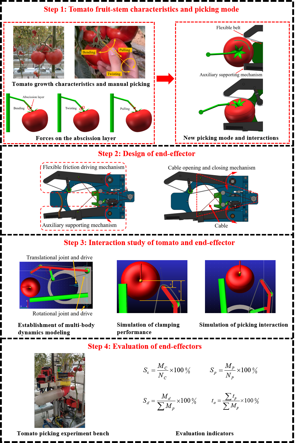 近日,机电学院苑进教授团队在《Computers and Electronics in Agriculture》,发表题为“Design and interaction dynamics analysis of a novel hybrid bending-twisting-pulling end-effector for robotic tomato picking”的最新研究成果。博士研究生方家明为论文第一作者,机电学院苑进教授和刘雪美教授为共同通讯作者,辛振波副教授、戴念祖博士生参与课题研究,鸭脖为唯一通讯单位。
