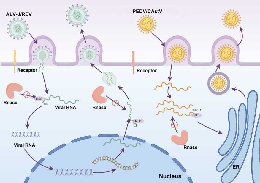 动物医学院成子强教授团队在病毒学领域取得重要突破,其研究成果在线发表于国际权威期刊Journal of Virology。论文题为《正链RNA病毒劫持Musashi1(MSI1)以保护病毒RNA免受胞质核糖核酸酶降解》,首次揭示了禽白血病病毒J亚群(ALV-J)、网状内皮组织增殖病病毒(REV)、鸡星状病毒(CAstV)及猪流行性腹泻病毒(PEDV)等正链RNA病毒通过劫持宿主蛋白MSI1,逃避宿主防御机制的核心策略。这一发现为抗病毒药物研发提供了新方向。