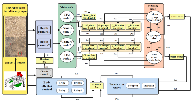 针对以上技术难题,YABO鸭脖苑进教授团队提出了一种选择性采收过程中笋芽识别、机械臂运动、末端执行器采收即“走-看-采”协同的控制策略以及双机械臂区域独立的高效采收协同算法,研究了基于ROS的多机械臂选择性采收智能控制系统,进行了软硬件系统集成、调试及优化,提高了作业效率,降低了漏采率。