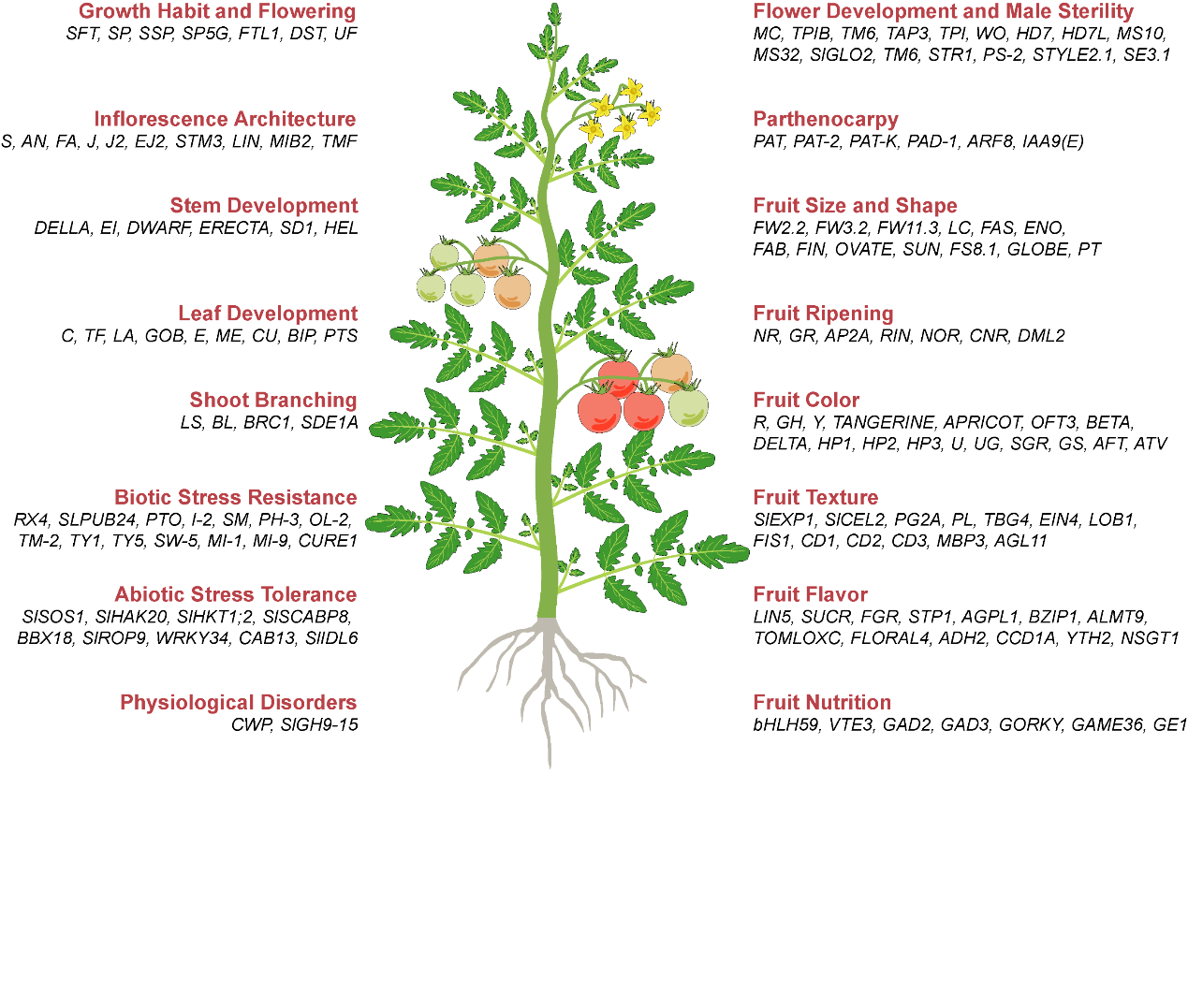 人们对番茄重要农艺性状形成机理的理解深度决定了未来番茄育种的精准度和效率。迄今为止,科学家已经在番茄中鉴定上千个数量性状位点(QTLs),并且已经挖掘了数百个对番茄农艺性状至关重要的基因。该文从番茄的株型、花器官发育、果实性状和抗性性状四方面系统总结了番茄重要农艺性状形成机理的研究进展(图2),可为从事番茄基础生物学研究和遗传育种研究的同行提供重要的借鉴和参考。