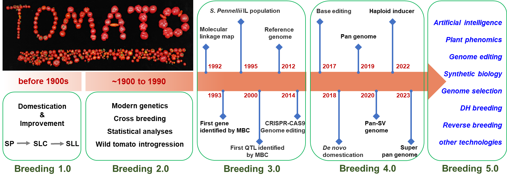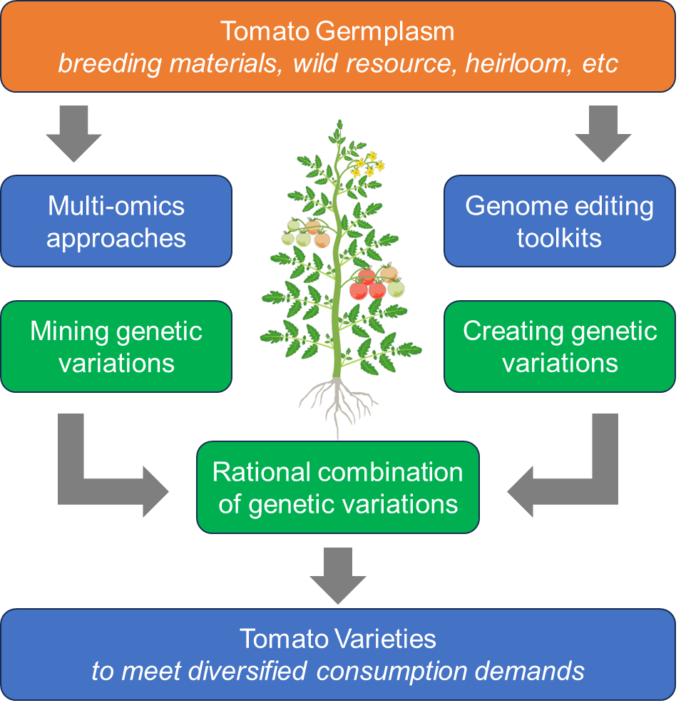 番茄(Solanum lycopersicum)是世界范围内广泛种植的蔬菜作物,同时也是一种重要的水果替代品。现代栽培番茄起源于南美洲安第斯山脉,由野生醋栗番茄驯化改良而来:第一步,醋栗番茄SP驯化为过渡种SLC;第二步,由过渡种SLC改良为现代栽培番茄SLL。现代栽培番茄根据其用途可分为鲜食番茄(水果用、沙拉用或菜用)和加工番茄(番茄泥、番茄罐头、番茄酱和番茄汁等)两大类。目前,中国已成为世界最大的番茄生产和消费国,年产量在6700万吨左右。除了作为重要的果蔬作物,番茄还是人们研究遗传学、基因组学、果实发育和植物育种的经典模式植物。以番茄为对象,人们发现了第一个多肽类植物激素系统素(systemin);构建了作物中第一张高密度分子连锁图谱;克隆了作物中第一个数量性状位点Fw2.2;在植物中首次克隆了符合“基因对基因”假说的抗病基因Pto以及鉴定了机械损伤诱导植物再生的原初信号分子REF1。过去30年,分子生物学和高通量测序技术等的飞速发展,特别是2012年番茄参考基因组测序完成和2013年CRISPR/CAS9基因编辑技术在植物中的应用,极大推动了番茄功能基因组学和遗传育种方面的研究。迄今为止,人们已经对超过300个番茄基因的功能进行了深入的研究,其中一些基因在加速番茄性状改良和品种培育方面发挥了重要作用。与此同时,高效分子育种技术的蓬勃发展,包括基因编辑、全基因组选择、单倍体育种及雄性不育制种等先进技术,正逐步融入番茄品种改良的实践之中。这些技术的应用,不仅提高了育种效率与精准度,还为实现番茄作物的遗传改良与产量提升开辟了新途径。