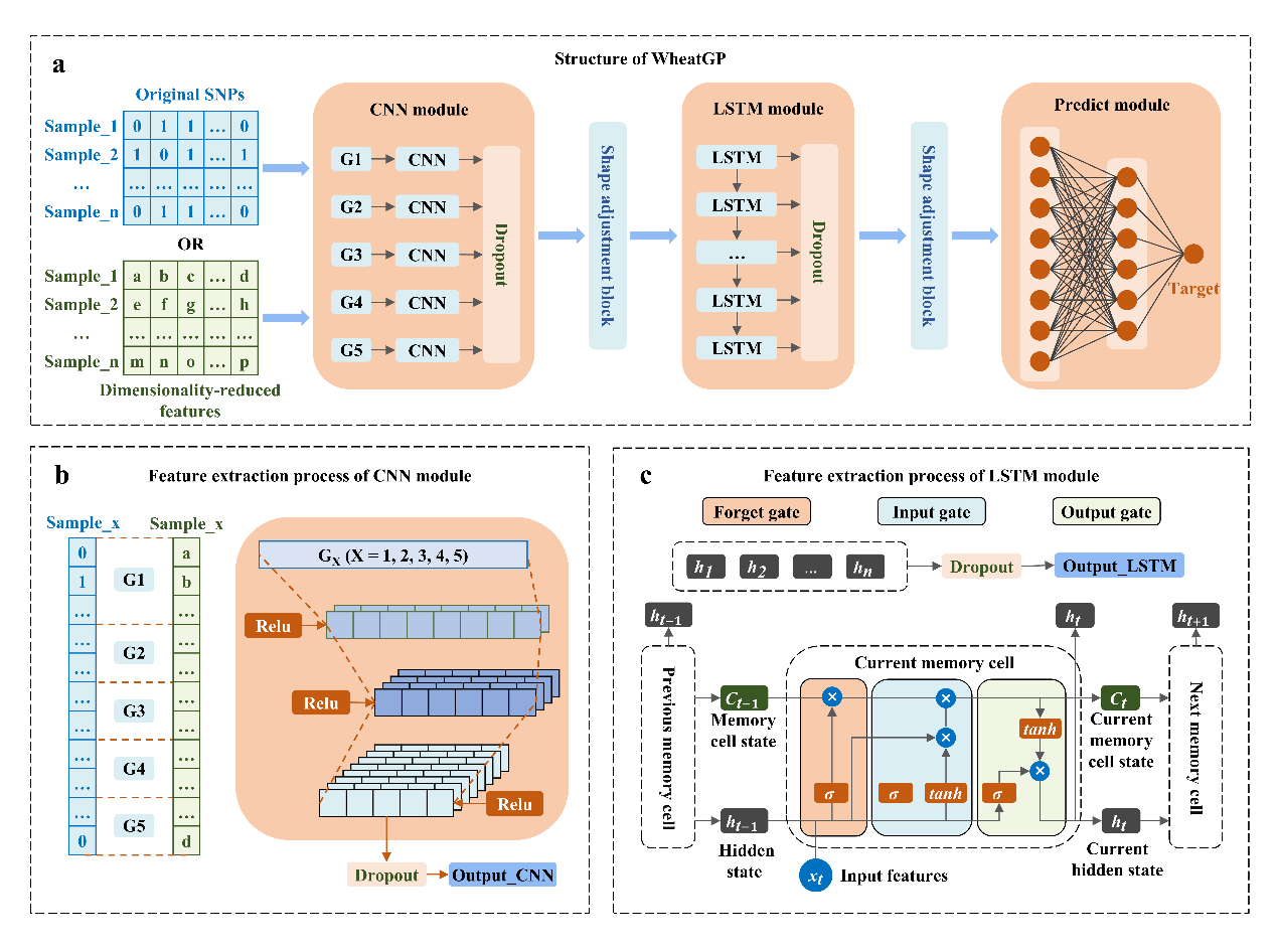 研究团队基于卷积神经网络(CNN)和长短期记忆神经网络(LSTM)提出了一种小麦基因组预测方法(WheatGP),利用了多层CNN捕获基因组序列中的短程依赖性和LSTM独特的门控机制,提取并保留基因位点之间的长距离的依赖关系。