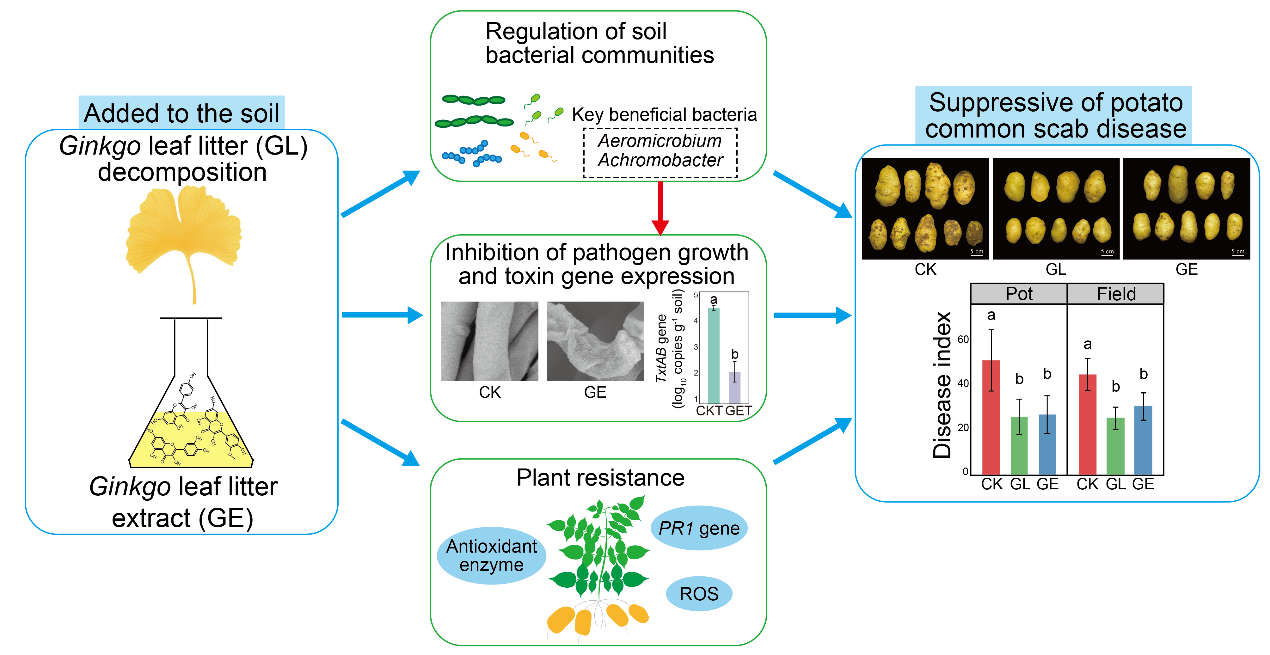 马铃薯疮痂病是由多种链霉菌引起的土传病害,表现为块茎表面产生结痂病斑,严重降低马铃薯的品质和市场价值。土壤微生物作为生态系统的关键组成部分,在维持土壤健康和功能以及预防和治理土传病害方面发挥着至关重要的作用。研究评估了银杏落叶(GL)及其提取物(GE)对马铃薯疮痂病的抑制效果,盆栽和田间试验发现,两处理均显著降低了疮痂病病害指数,降低了疮痂病病原菌在土体土和薯表土中的相对丰度。土壤微生物组分析发现,细菌群落与病害指数显著相关,其中土体土的细菌群落对病害抑制的贡献占52%。进一步,GL和GE增强了细菌群落组装中的随机过程,并增加了细菌共生网络的复杂性。经GE重塑的微生物群落显著抑制了病原菌毒素基因txtAB的表达。关键有益菌株气微菌(AeromicrobiumOH2-5)与无色杆菌(AchromobacterYD1-3)被分离,其生长受GE促进且对病原菌具拮抗作用。扫描电镜显示GE处理8小时后显著破坏致病链霉菌菌丝形态。此外,GE处理减轻病原侵染引起的马铃薯活性氧积累,上调马铃薯防御基因PRI表达,降低细胞死亡率。综上,研究通过盆栽与田间试验,结合微生物组学、病原菌毒性基因分析及植物免疫响应检测,揭示了银杏落叶抑制马铃薯疮痂病的多维防控机制,为马铃薯疮痂病的生态防控提供了思路。