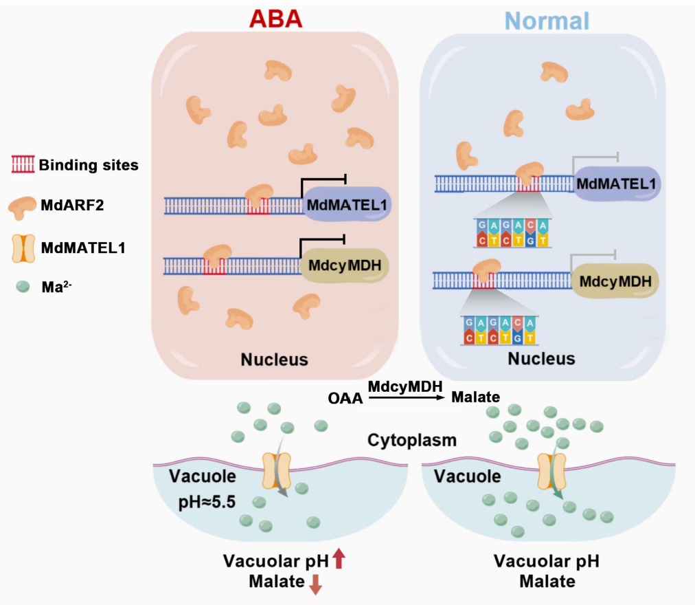 该研究表明,在苹果杂交群体中,MdARF2的表达水平与苹果酸积累呈显著负相关,MdARF2-RNAi转基因株系中的苹果酸含量显著高于对照。进一步在拟南芥中验证发现,arf2-7突变体中苹果酸含量升高,而在该突变背景中过表达MdARF2可恢复其野生型表型,表明ARF2作为苹果酸积累的负调控因子具有保守功能。生化实验证实,MdARF2可直接结合苹果酸转运蛋白MdMATEL1和细胞质苹果酸合成关键酶MdcyMDH的启动子区域,抑制其转录,从而降低苹果酸的积累。此外,杂交群体中ABA浓度变化与MdARF2的表达趋势一致,且与苹果酸含量呈负相关关系。外源施加ABA 可显著降低果实和愈伤组织中的苹果酸含量,伴随着MdcyMDH和MdMATEL1表达的下调及MdARF2表达的上调。GUS活性检测进一步证实ABA可增强MdARF2对MdcyMDH与MdMATEL1的转录抑制作用。在ABA处理背景下沉默MdARF2能阻碍ABA对苹果酸积累的负调控效应。综上所述,该研究阐明了ABA信号通过“MdARF2–MdcyMDH/MdMATEL1”模块抑制苹果酸合成与转运的机制,为解析激素信号调控果实有机酸代谢提供了新的理论依据。
