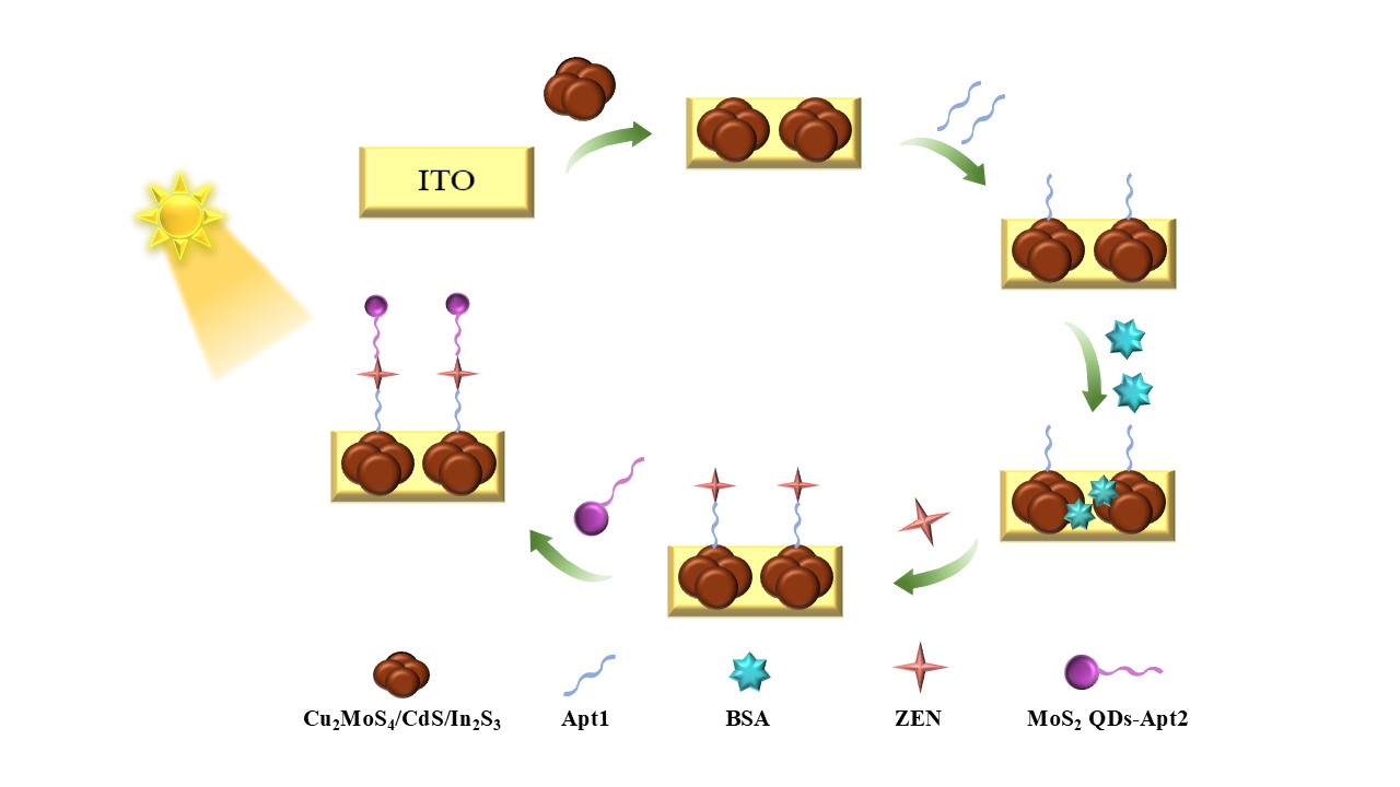 鉴于此,研究团队基于Cu2MoS4/CdS/In2S3纳米团簇为基底材料,结合MoS2量子点,在双适配体与目标物的共同作用下,构建了一种高灵敏、高选择性的“夹心型”光电化学传感器用于玉米赤霉烯酮的检测。“夹心型”的构建以及适配体的特异性为传感体系提供了较宽的线性浓度范围以及极低的检出限。这项工作表明,该研究所构建的光电化学传感器可以实现低含量玉米赤霉烯酮的检测,并可以通过改变传感器的适配体来实现对其他目标物的分析。
