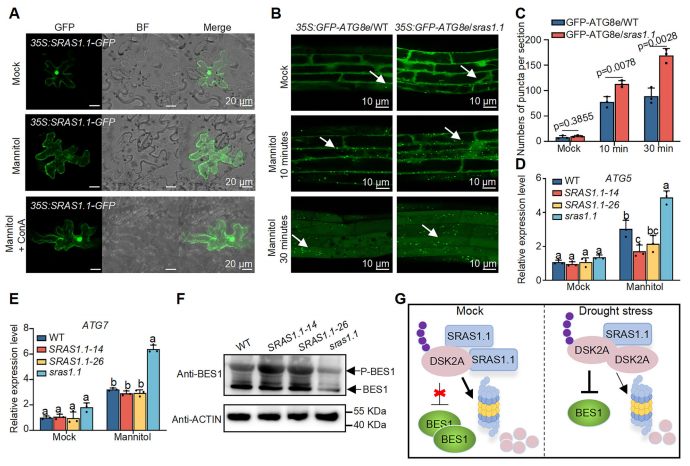 本研究研究通过遗传学和分子生物学方法深入解析了SRAS1.1在干旱胁迫中的功能。研究者利用拟南芥的过表达株、突变体以及互补材料系统地比较了其干旱胁迫下的表型,结果发现,sras1.1突变体在干旱条件下表现出显著增强的耐旱性。在干旱胁迫下SRAS1.1的亚细胞定位会发生改变:它从细胞核转移至细胞质,形成自噬小体。进一步分子实验解析表明,SRAS1.1与自噬受体DSK2A直接互作,促进其泛素化修饰并在26S蛋白酶体中降解。通过促进DSK2A降解,调节BES1在干旱胁迫下含量,调节自噬反应的平衡,进而调控干旱胁迫响应。