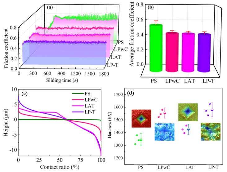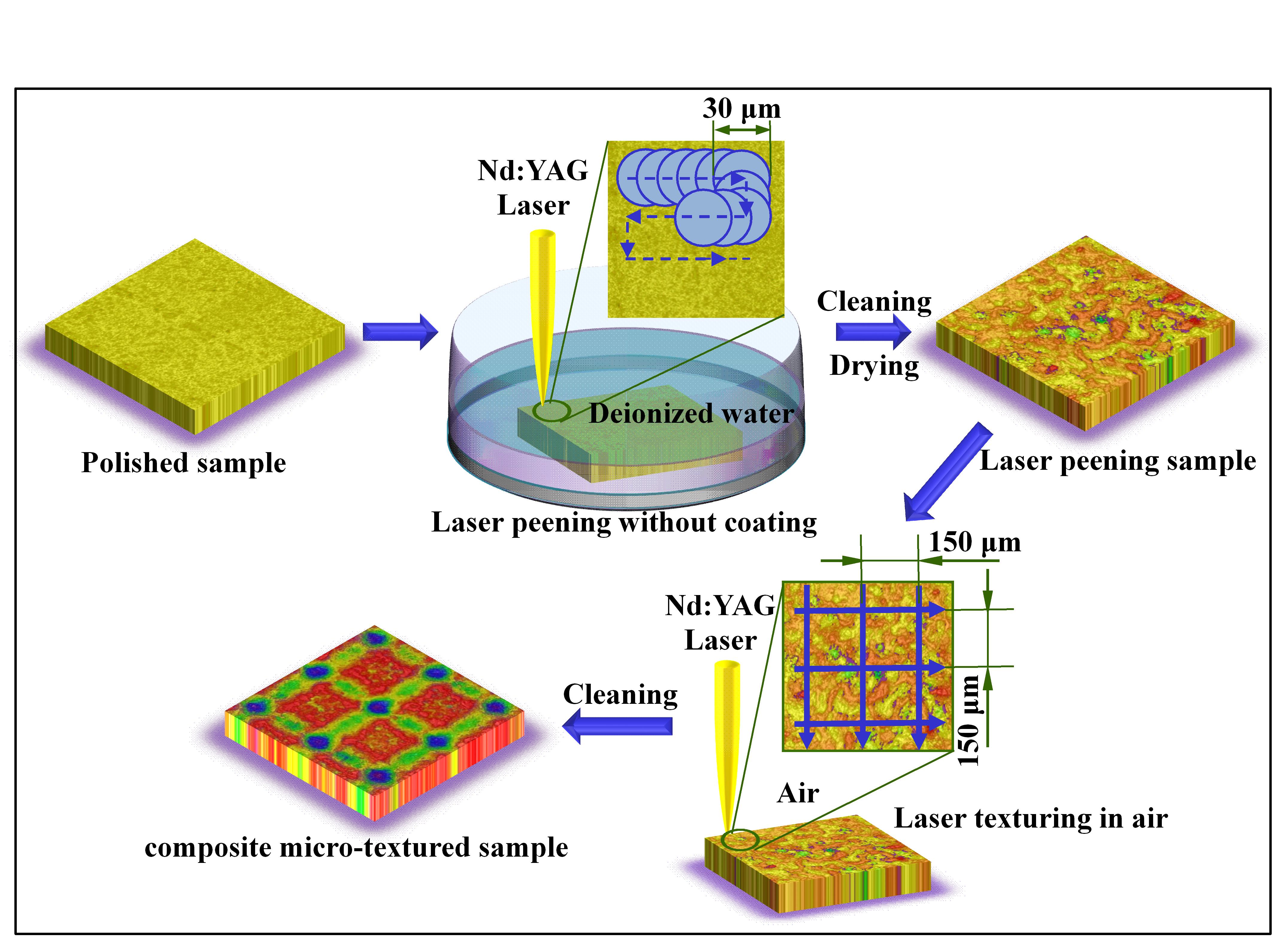 针对以上技术难题,团队提出了一种结合激光喷丸和织构化加工的新工艺,在YG8硬质合金表面制备复合微织构。通过对试样表面的微观结构、粗糙度、硬度、残余应力、摩擦磨损性能和切削性能的试验研究,发现复合微织构表面展现出最优异的物理机械性能。该研究为硬质合金表面改性提供了新的思路和方法,通过优化表面特性大幅提升了硬质合金性能,有望在高性能切削工具和农机耐磨部件的制造中得到广泛应用。
