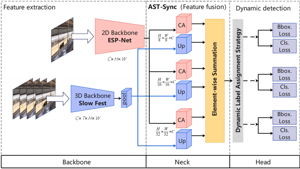 针对以上问题,团队提出了一种基于巡检机器人和时空特征融合算法(Cattle-ES3D)的肉牛呼吸急促和流涎行为检测方法(图1)。团队首先提出了一种混合架构,将嵌入式空间金字塔网络和SlowFast双通路网络集成在一起,实现肉牛行为时空特征的提取;其次,设计了自适应时空特征融合同步模块,实现时空特征的自适应融合;最后,设计了一个轻量级的动态检测分支,通过时空动态标签赋值驱动的多维参数优化机制,实现分类-回归特征空间对齐和时间关联约束。实验结果表明,该方法具有时空特征,提高了肉牛呼吸急促和流涎行为的检测精度,降低了计算成本。