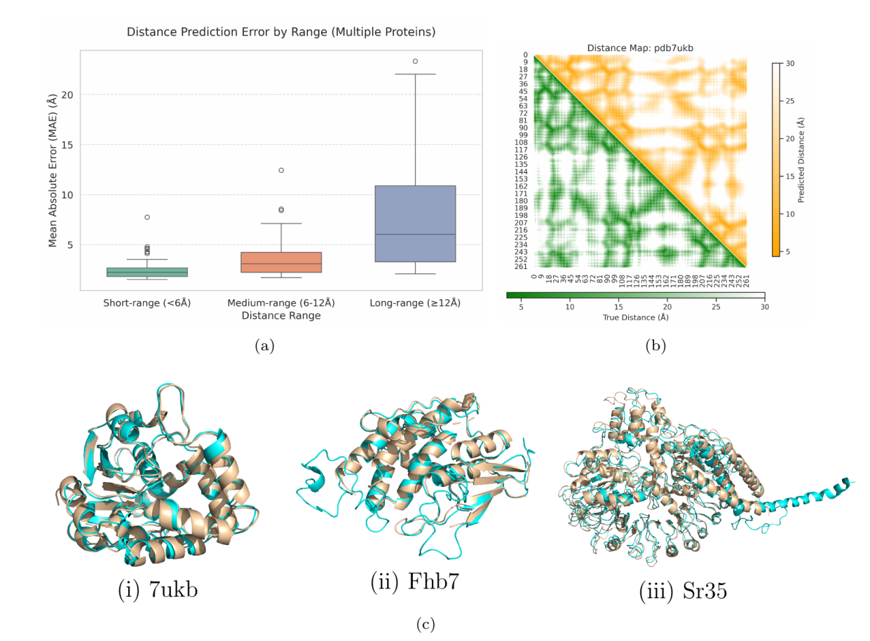其二,“group pooling”策略实现高效的特征降维与融合;其三,Diff-former 特征学习模块结合三角注意力机制与扩散模型以强化残基间关系建模。在蛋白质实值距离预测任务中,MF-ProtDisMap的MAE和RMSE分别为2.20Å和3.40Å,优于ESMFold的2.56Å和5.38Å。此外,在接触预测任务的验证中,该模型的 ROC 值为 84.56%,PR 值为 81.01%,均超过了现有最佳方法。鉴于缺乏能够直接从实值距离预测重建蛋白质结构的可用工具,团队开发了ProtDisFold,用于距离约束结构建模,并成功重建了祖先植物α/β-水解酶(PDB ID:7ukb)、Fhb7-GST和植物NLR Sr35的三级结构。本研究将助力作物改良精准设计、基于冷冻电镜刻画微观结构等领域发展。