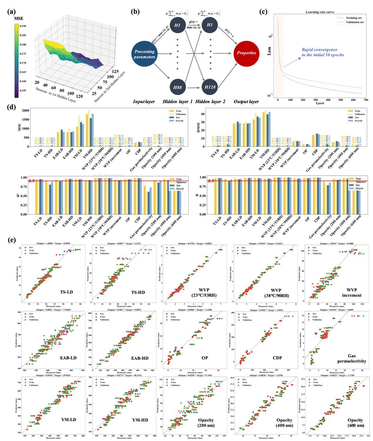 为此,本研究构建了一个仅包含淀粉、甘油与PBAT的简化体系,以系统研究淀粉/PBAT复合材料在挤出成膜过程中的结构演变。在此基础上,通过挤出吹塑工艺共制备了60种不同配方的淀粉/PBAT薄膜,建立了包含18个变量的数据库,涵盖淀粉比例、加工步骤、螺杆转速、机械及阻隔性能等指标。结果表明,成膜过程中淀粉发生了键断裂、双螺旋结构崩解与分子量降低;而在吹膜阶段,淀粉与PBAT相内的分子重排及结晶状态变化导致体系出现相分离现象。通过三因素方差分析、两步聚类分析以及Pearson与Mantel相关性分析,揭示了成膜参数与薄膜理化性能之间的内在联系。在此基础上,构建了基于加工参数的人工神经网络模型,实现了对薄膜机械与阻隔性能的精准预测,模型表现出较高的拟合度(R> 0.9)与良好的泛化能力。本研究有助于深入理解加工条件对淀粉/PBAT薄膜结构与性能的影响机制,并为其工业化制备与性能优化提供了重要的理论与数据支撑。