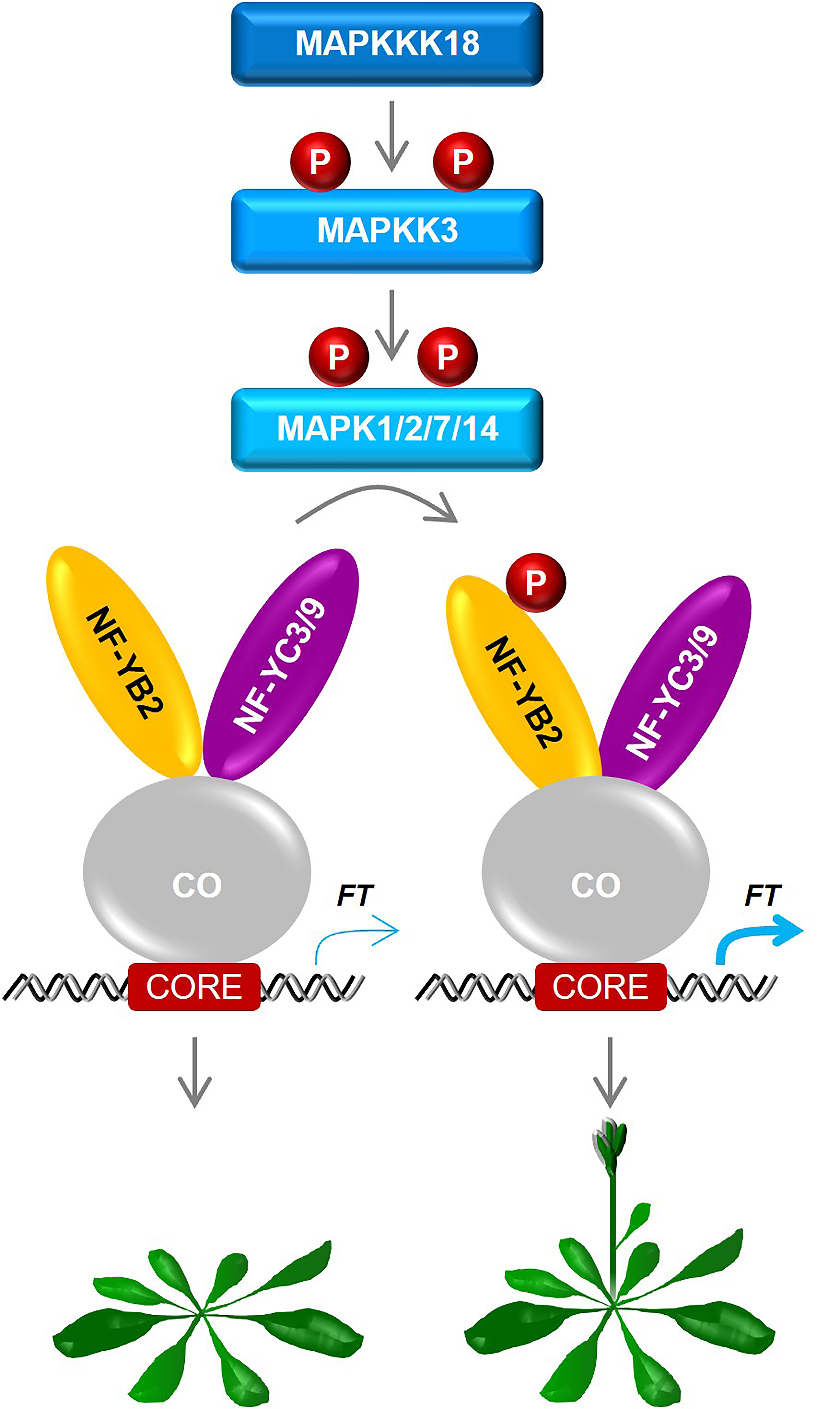 进一步的研究表明,磷酸化修饰对NF-YB2的亚细胞定位及蛋白稳定性均没有影响,但磷酸化形式的NF-YB2与NF-YC3/9及CO (CONSTANS)间的互作增强,且形成异源三聚体后,CO识别结合FT(flowering locus T)启动子中CORE元件的能力显著提高,FT的表达水平上升,进而导致早花(图3)。