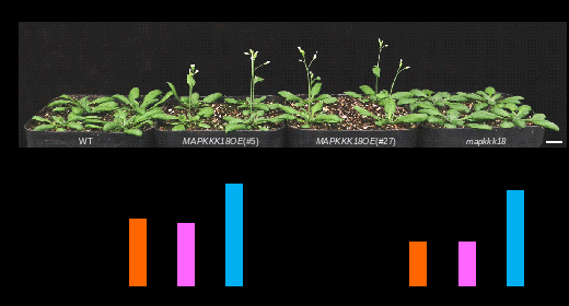 拟南芥MAPKKK18在干旱及ABA信号转导过程中发挥重要功能。该研究发现MAPKKK18超表达株系的开花时间明显早于野生型,而mapkkk18突变体则显著晚花(图1)。MAPKKK18的下游组分MAPKK3及MAPK1/2/7/14突变后拟南芥的开花时间均延迟,表明MAPKKK18-MAPKK3-MAPK1/2/7/14级联途径正调控拟南芥开花时间。