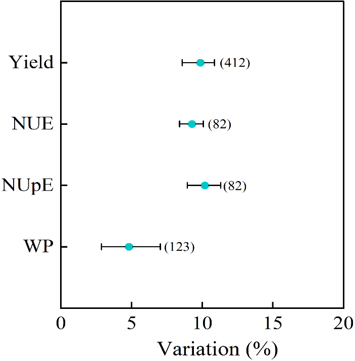 图2 宽幅播种与常规条播对小麦产量、氮素利用效率(NUE)、氮素吸收效率(NUpE)和水分生产力(WP)的影响(圆点表示均值,误差线代表95%置信区间(CIs),置信区间括号内的数字表示样本量,下同)