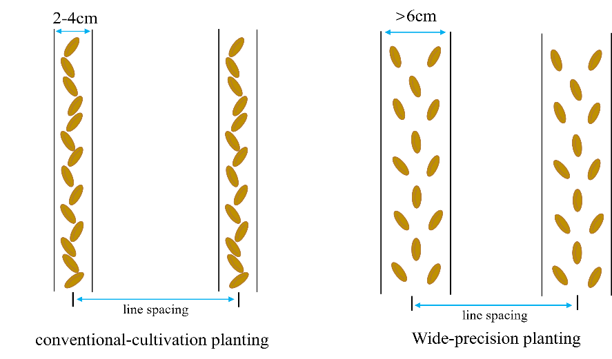 图1 小麦常规条播与宽幅播种大田对比图和示意图