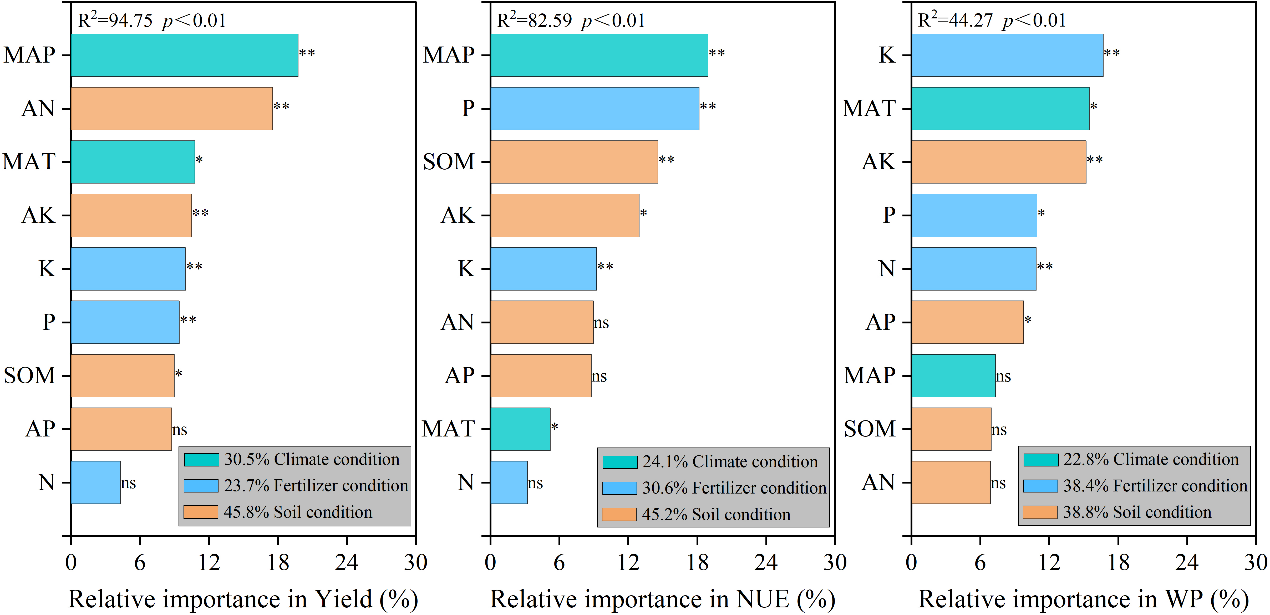 图3 基于随机森林回归模型的宽幅播种下影响小麦产量、氮素利用效率(NUE)和水分生产力(WP)提升的各变量相对重要性(%)