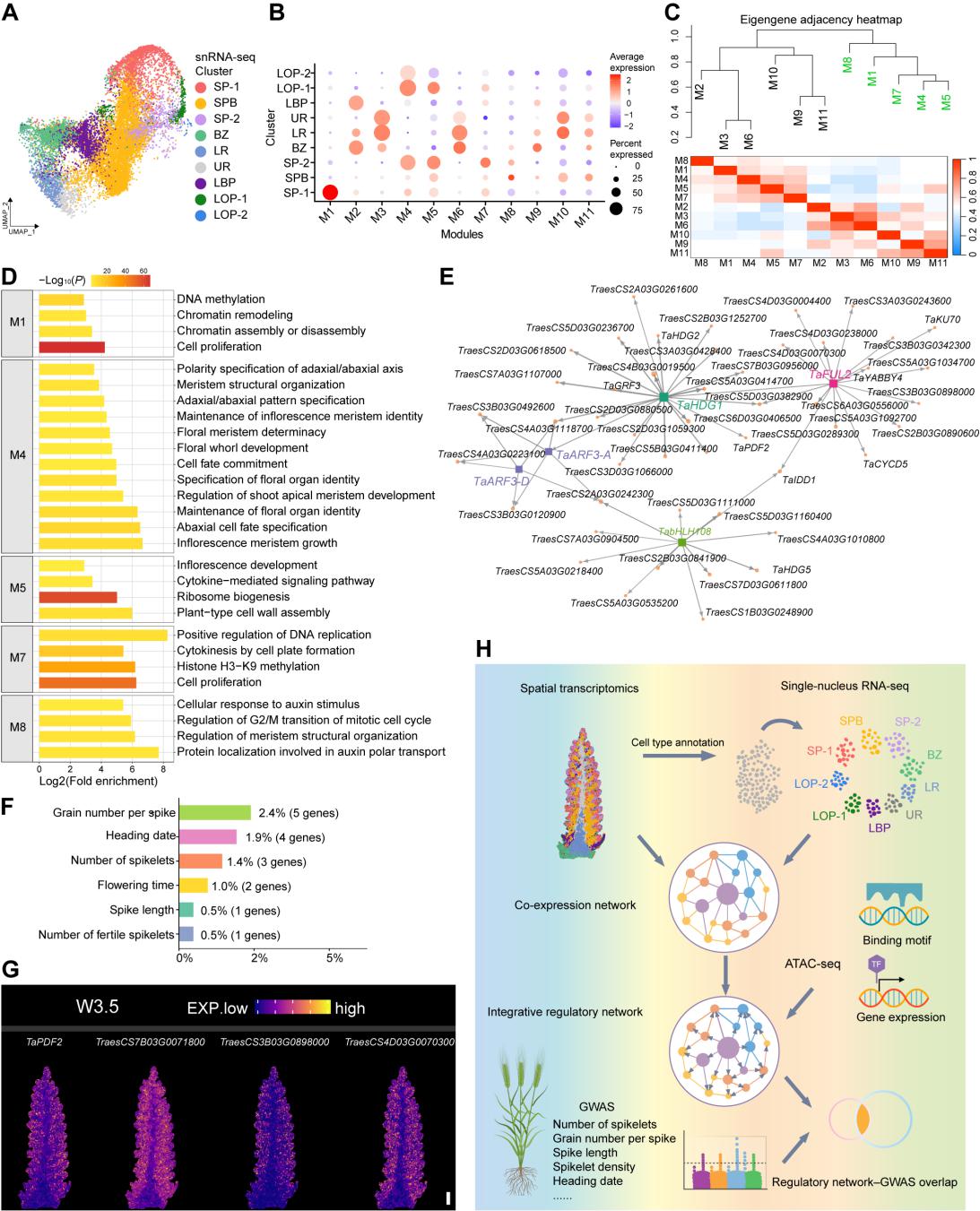 为进一步解析细胞类型特异的穗发育调控机制,研究人员构建了W3.5时期小麦穗的单核转录组数据,并与空间转录组进行整合分析。通过标签转移精细化细胞注释,并结合WGCNA分析,鉴定出11个共表达模块,其中多个模块在小穗原基区域显著富集。GO富集分析表明,模块4与花序/花分生组织发育、器官极性及命运决定密切相关,是潜在的核心调控模块。通过进一步整合多组学调控关系和GWAS数据,研究人员构建了穗发育的时空调控网络,鉴定出包括FUL2和TaPDF2在内的关键调控因子。该结果表明,空间锚定的单核转录组联合分析能够有效识别小麦早期穗发育的核心调控网络,并为挖掘产量相关功能基因提供重要候选资源。