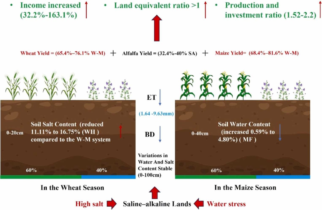近日,农学院宁堂原团队在《Field Crops Research》发表了题为“Wheat–maize intercropping with alfalfa increases crop yield, quality, and economic benefits by controlling water and salt dynamics in saline–alkaline lands”的研究论文。揭示了在盐碱地生态系统中,小麦-玉米与耐盐苜蓿间作通过调控土壤水盐动态,实现粮食与饲草协同增产及土地经济效益提升的关键机制。